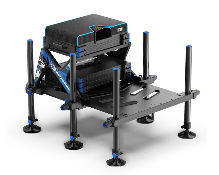 Die „X“-förmige Rahmenkonstruktion ruht auf 6 schwarzen, eloxierten PINLOCK-Teleskopbeinen, die optimale Stabilität auf jedem Terrain garantieren. Die AIRVENT-Ablageplatte, clever unter dem Rahmen platziert, bietet eine praktische Lösung zur Organisation der Stippfischerei-Ausrüstung.