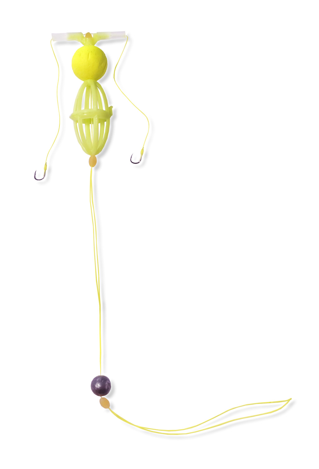 Spezial-Rig für Silberkarpfen, das sowohl für Grund- als auch für Posenmethoden geeignet ist. Mit dem Blei an der Schnur kann die Höhe des Futterkorbs und damit der Haken zum Grund eingestellt werden. Das Blei fixiert gleichzeitig das Rig. Am Ende der Schnur kann entweder ein Feeder- oder ein Posen-Rig befestigt werden. Der Korb lässt sich öffnen und so befüllen. Eine futtersparende Lösung. Das Rig verfügt über zwei Haken, deren Vorfachlänge ebenfalls einstellbar ist.