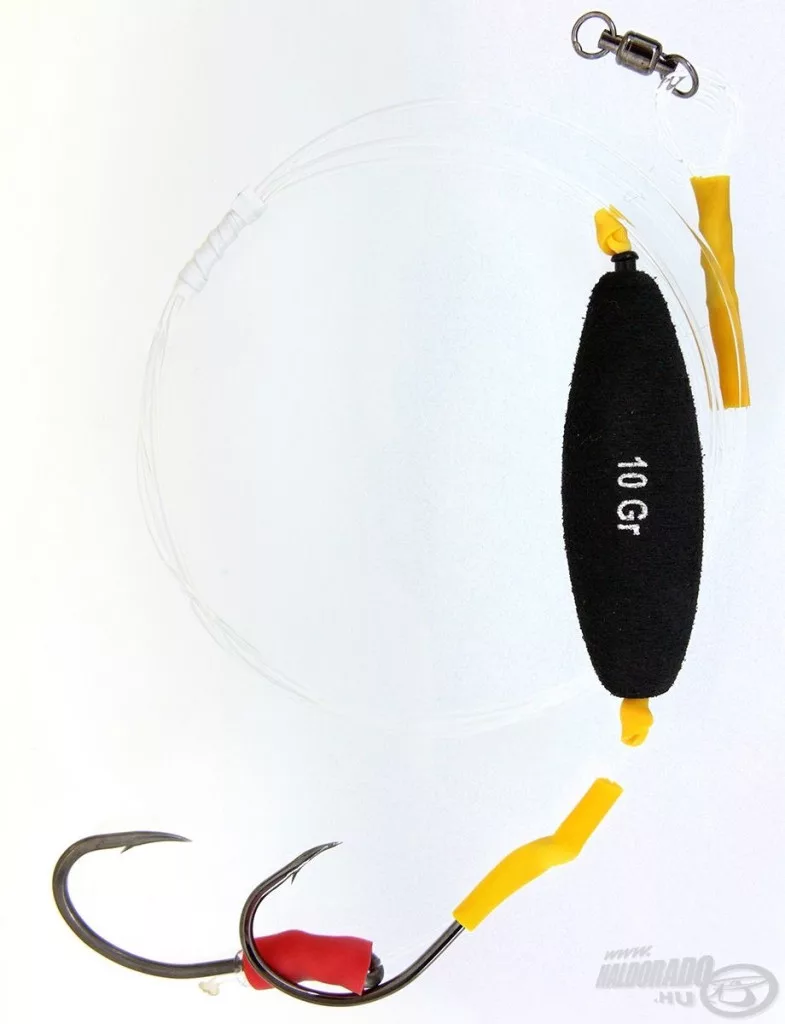 3. Geeignet zur doppelten Köderfischpräsentation; dank des verstellbaren Hakens können die Köderfische in beliebiger Entfernung angeboten werden. Durch die Steifigkeit des Vorfachs können wir außerdem sicher sein, dass sich die Köderfische nicht verheddern.