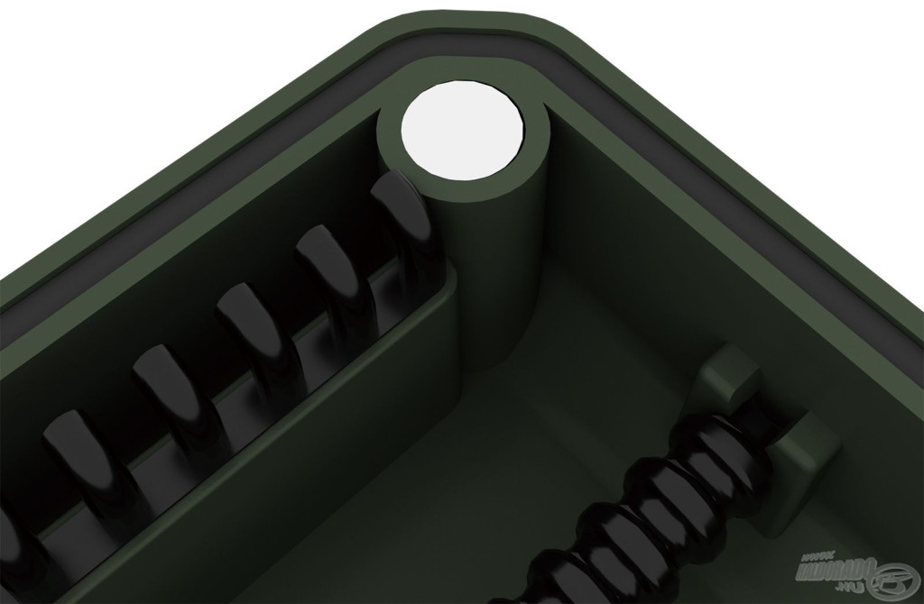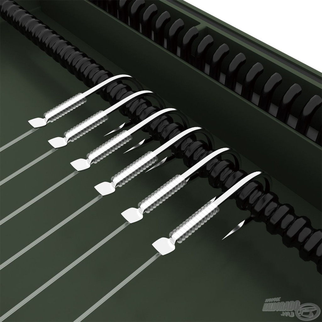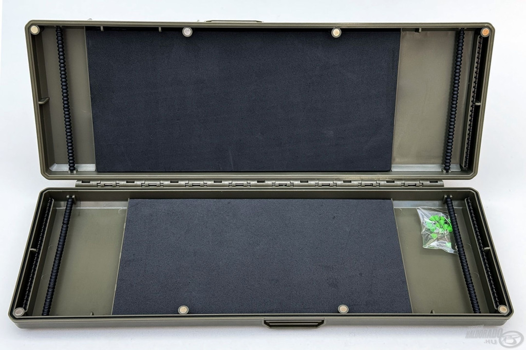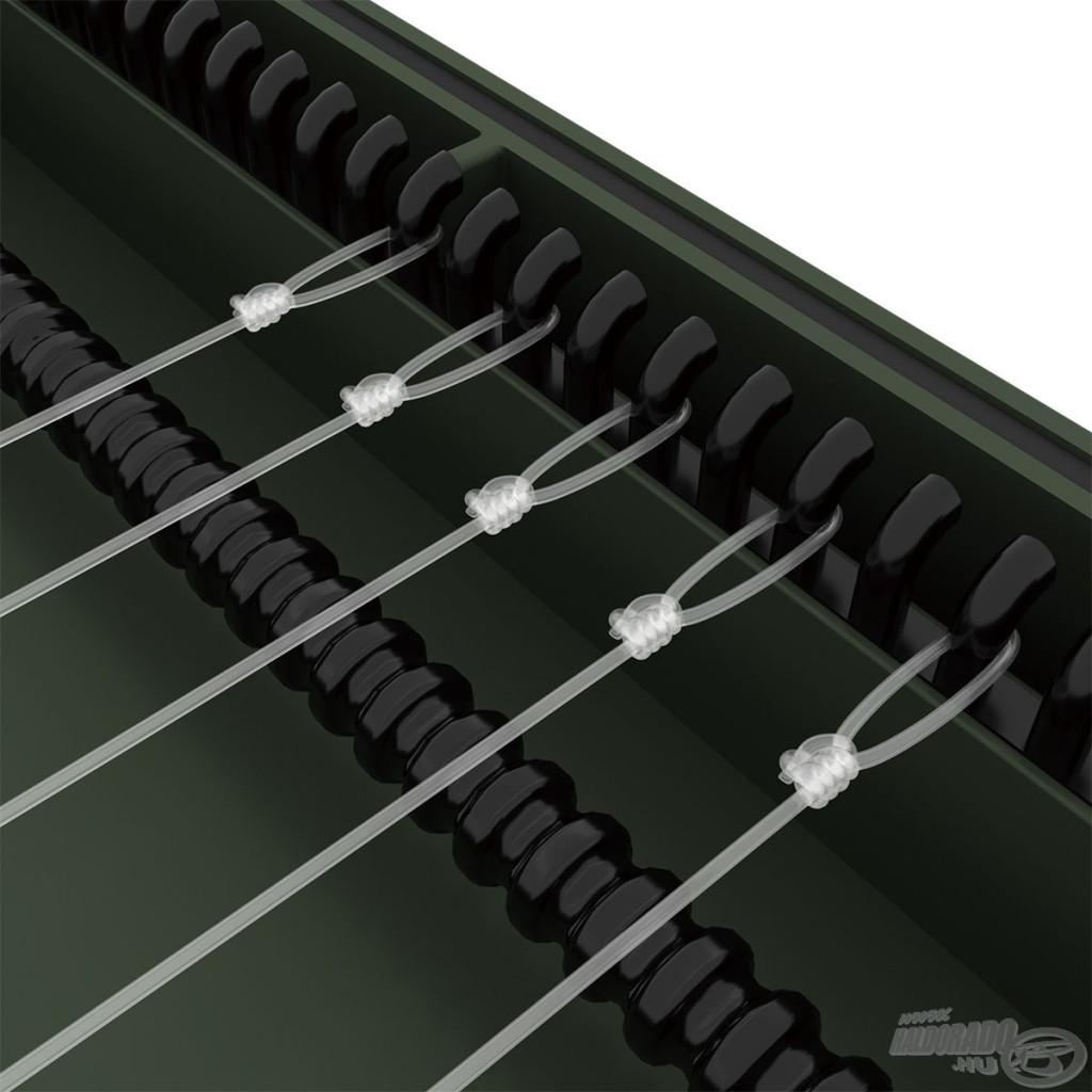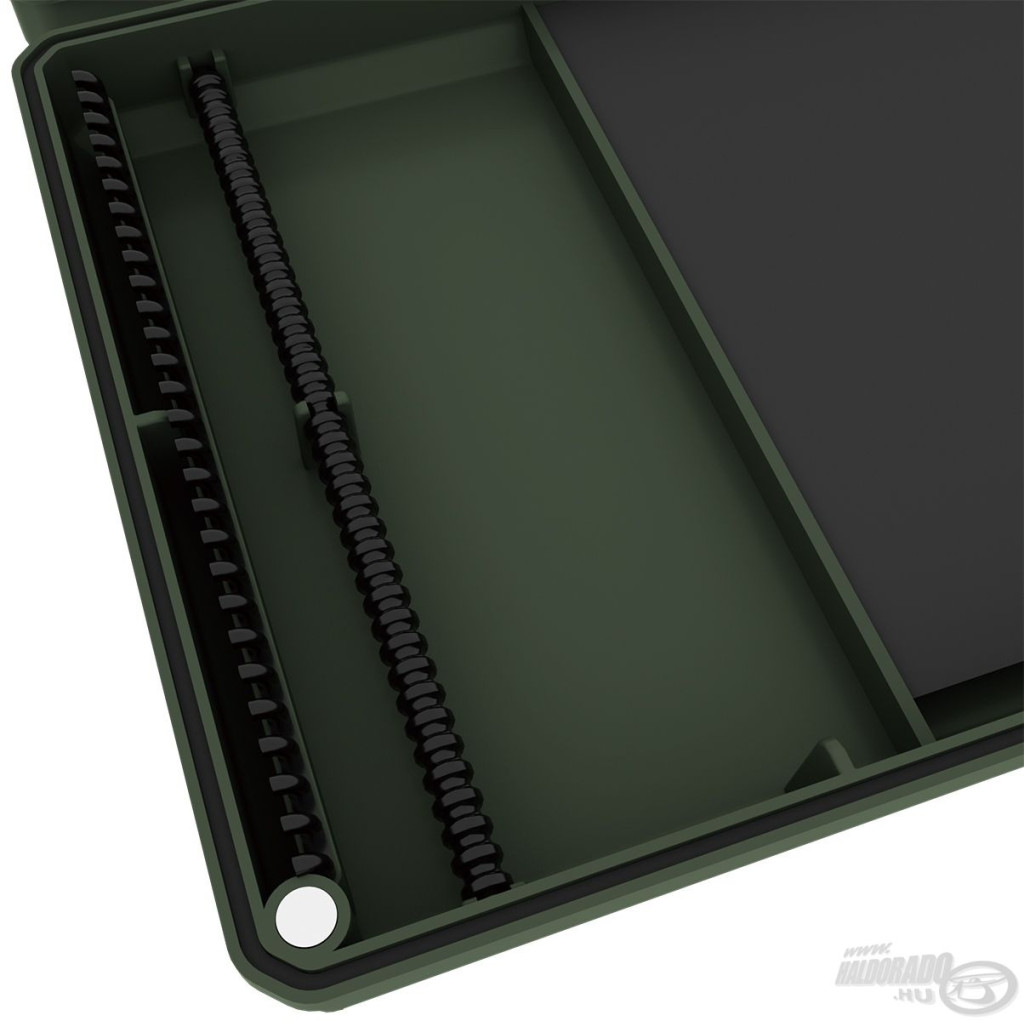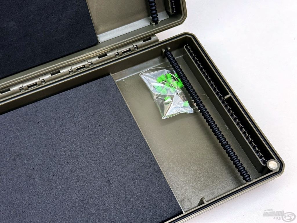 Das Innere der Box ermöglicht eine präzise Vorfachbefestigung: Die Schlaufe des Haken-Vorfachs muss in einen Haken auf der einen Seite eingehängt werden, während der Haken selbst sicher in den ultrastarken EVA-Schaum gestochen werden kann. Diese Lösung fixiert und schützt die Vorfächer nicht nur, sondern verhindert auch Verwicklungen, Verformungen oder Beschädigungen. Die Carp Rigs Box ist eine ausgezeichnete Wahl für längere Karpfen-Vorfächer, bei denen besonders wichtig ist, die präzise Platzierung und den Zustand der Montagen zu erhalten.