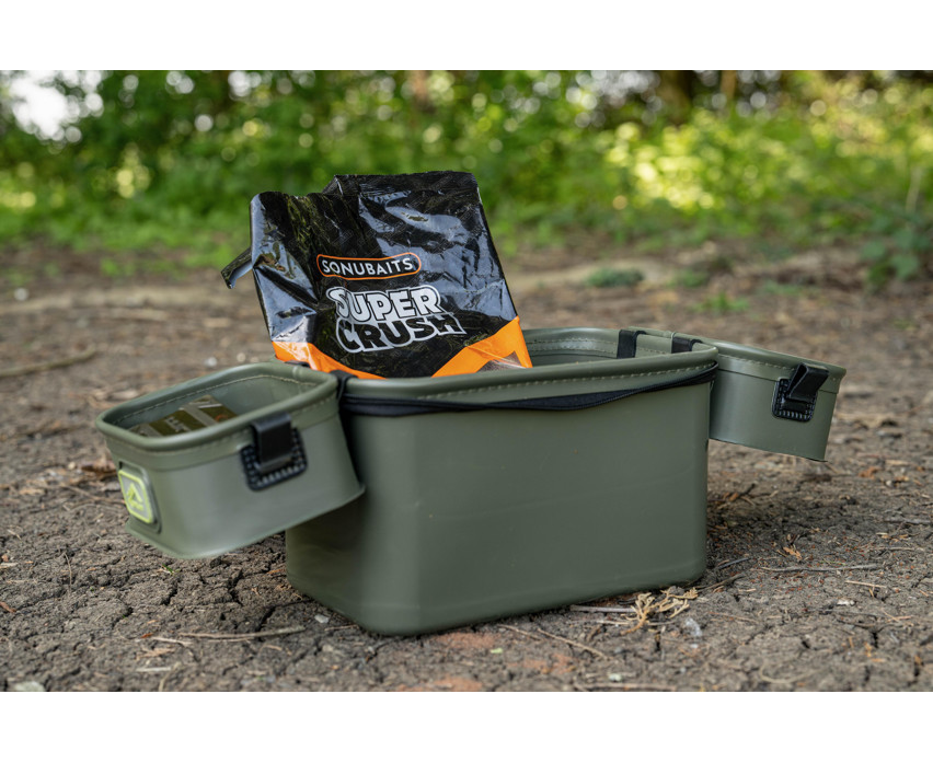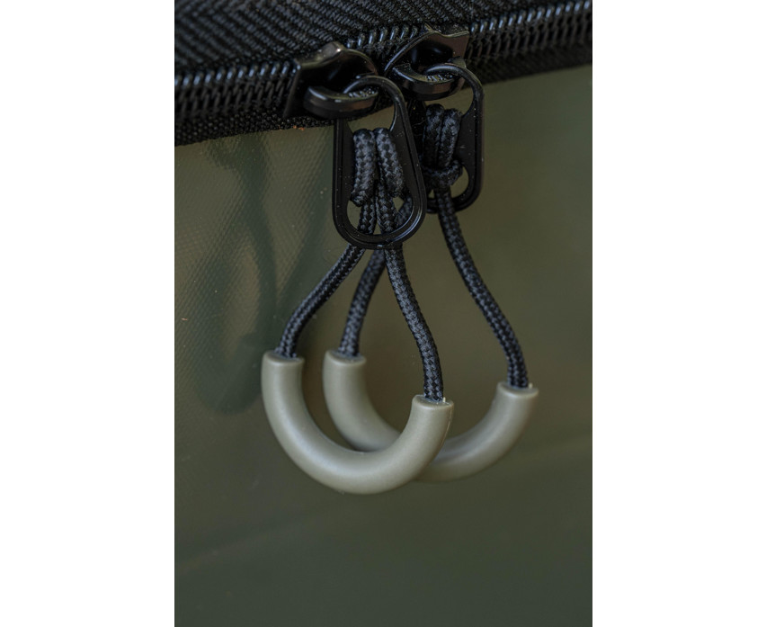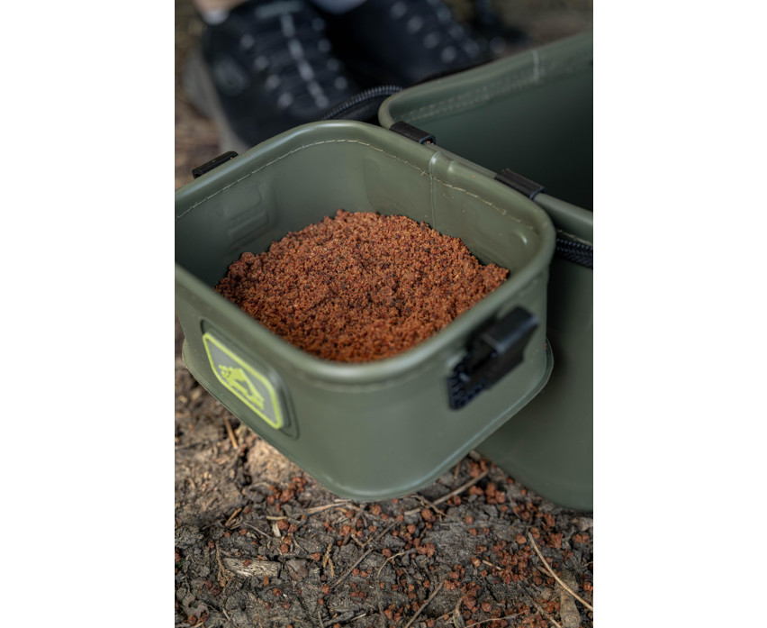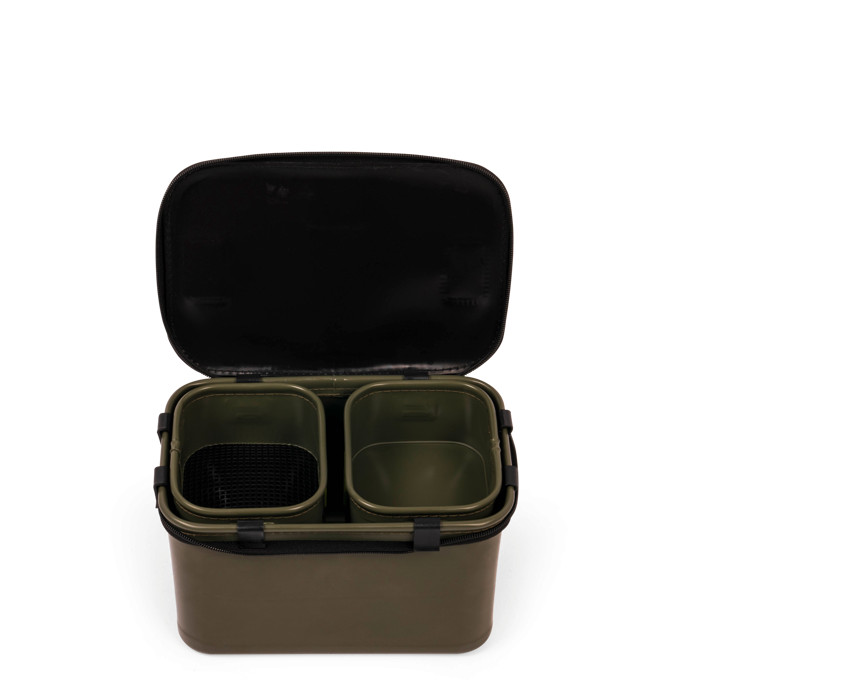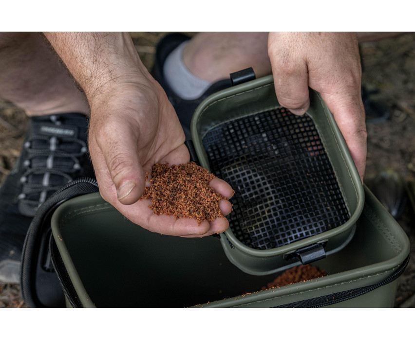 Die Tasche ist mit steifen, geformten Seitenwänden gefertigt, die die Stabilität der Struktur und eine lange Lebensdauer gewährleisten. Der Innenraum enthält zwei separate Schalen, von denen eine mit einem 3 mm Netz ausgestattet ist, wodurch sie sich hervorragend zum Sieben von Lebendködern oder Futter eignet. Die Schalen können während des Gebrauchs von außen an den Rand der Tasche geklemmt werden, wodurch eine größere Arbeitsfläche während des Angelns zur Verfügung steht.