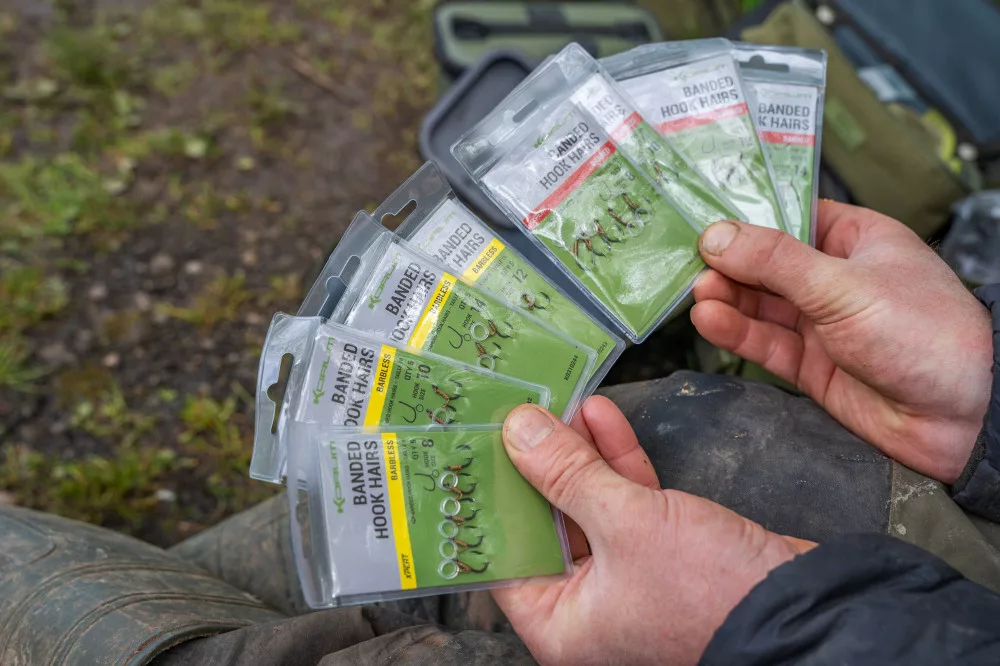 Der Packungsinhalt: Korum Banded Hook Hairs 10 Haken mit Widerhaken, Öhr und Pelletring 5 Stück