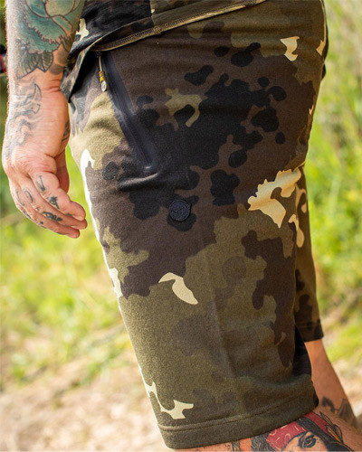 Korda Shorts mit Camouflage-Muster sind ideal zum Angeln, Wandern, für Outdoor-Aufenthalte oder für zu Hause. Hergestellt aus leichtem, aber strapazierfähigem Baumwoll-Jersey-Material. Bietet angenehmen Tragekomfort, überhitzt bei warmem Wetter nicht und lässt Sie nicht schwitzen, da Feuchtigkeit von der Haut abgeleitet wird. Passt sich der Körperform an und ist somit maximal bequem. Vordertaschen mit Reißverschluss und eine offene Gesäßtasche. Der Bund ist mit einem Kordelzug verstellbar.