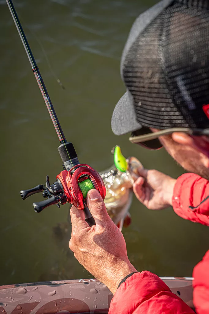 Die Funktionalität wird durch den patentierten, einziehbaren Speed Keeper® Köderhalter weiter erhöht, der eine bequeme und sichere Aufbewahrung des Köders ermöglicht, wenn er nicht in Gebrauch ist. Die zweistufige, titanbeschichtete Zirkonium-Schnurführung ermöglicht längere Würfe und sorgt gleichzeitig für ein glattes und präzises Schnurprofil, wodurch Verschleiß reduziert und die Wurfleistung verbessert wird. Die externe Schmieröffnung ermöglicht eine einfache Wartung, und das Level-Wind-System sorgt für eine gleichmäßige Schnurverteilung, sodass die Rolle verwicklungsfrei funktioniert.