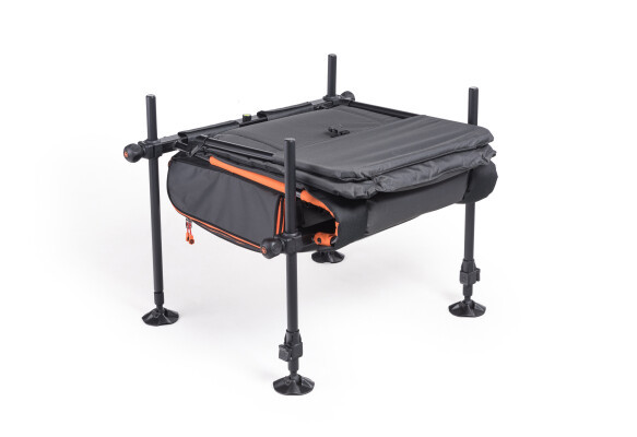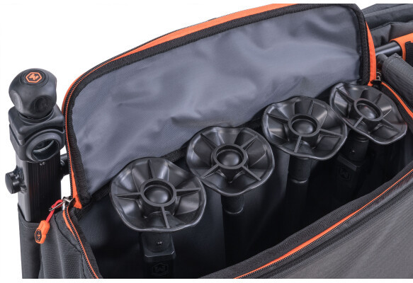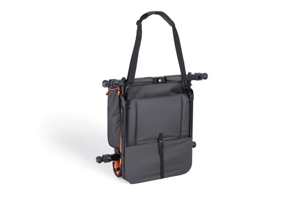 Einer der größten Vorteile des Modells ist der ergonomische Sitz und die Rückenlehne, die mit einer hochwertigen gepolsterten Matratze bezogen sind. Dies sorgt auch bei längeren Angelpartien für eine bequeme Haltung. Die vier verstellbaren Beine passen sich jedem unebenen Gelände an, und die integrierte Wasserwaage ermöglicht eine schnelle und präzise Nivellierung. Besonders nützlich an steilen Ufern sind die vorderen Teleskopbeine und die hochwertigen Schwenkfüße, die ein Einsinken verhindern. Ein großes Staufach unter dem Sitz bietet eine praktische Lösung zur Aufbewahrung von Haltern, Seitenablagen und anderem Zubehör. Für den Transport lässt sich die Rückenlehne einfach umklappen und mit einer Schnalle befestigen, und die Beine können in die am vorderen Teil des Sitzes angebrachten Griffe eingesetzt werden. Der mitgelieferte verstellbare Schultergurt erleichtert das Tragen.