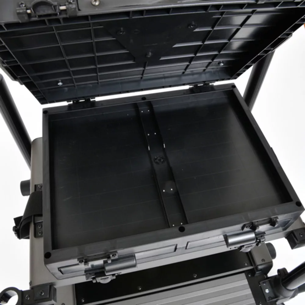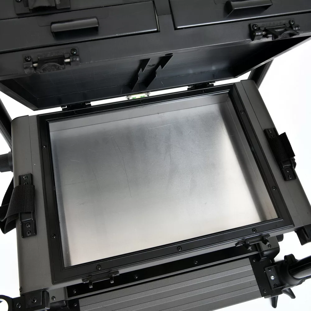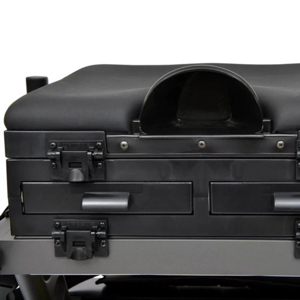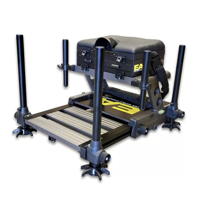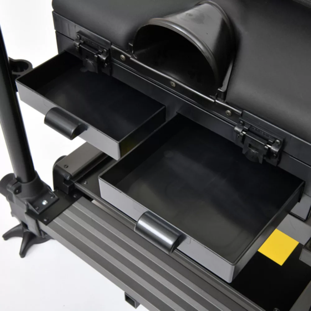 Die Sitzkiepe verfügt über mehrere Aufbewahrungseinheiten, darunter tiefere Module für größere Geräte und flachere Schubladen für Kleinteile oder Vorfächer. Ihre Abmessungen wurden so optimiert, dass sie bequem in den Kofferraum der meisten Autos passt und gleichzeitig ausreichend Platz für die gesamte Ausrüstung bietet. Die Schlammteller sind großflächig, sodass sie auch auf lockerem, schlammigem Boden unter großem Gewicht nicht einsinken.