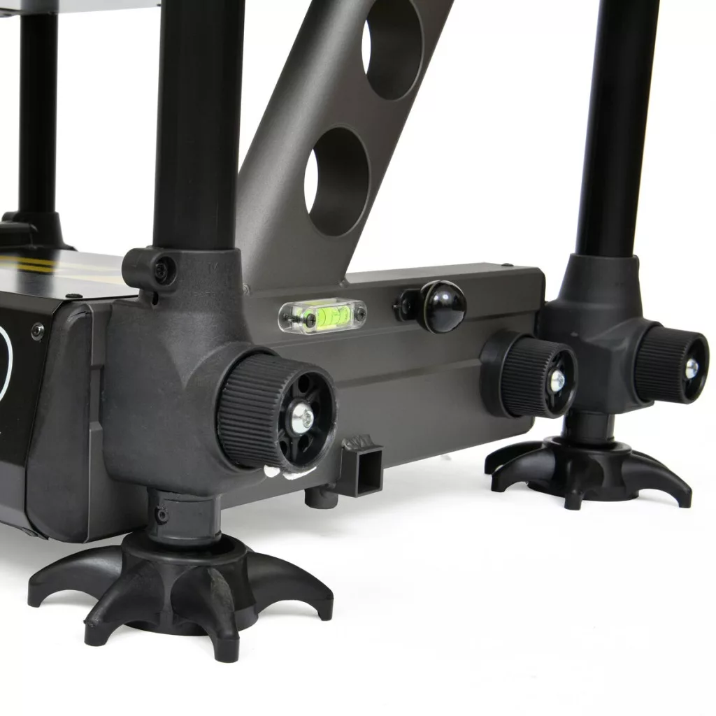Der Rahmen der Wettkampf-Sitzkiepe besteht aus einer leichten, aber hochbelastbaren Aluminiumlegierung, die korrosions- und mechanisch beständig ist. Die Beine haben einen Durchmesser von 30 Millimetern, was der Konstruktion eine hohe Stabilität verleiht und sie mit den meisten auf dem Markt erhältlichen Zubehörteilen wie Schirmhaltern, Ablagen oder Rutenhaltern kompatibel macht. Die Beine sind teleskopierbar, sodass ihre Höhe je nach Bodenbeschaffenheit in weiten Grenzen eingestellt werden kann.