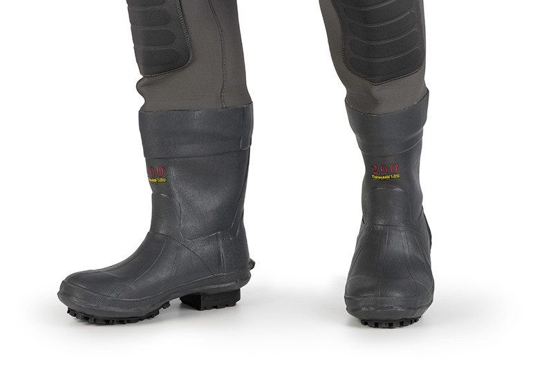 Der strapazierfähige Gummistiefelteil ist mit 200 Thinsulate® Ultra Isolierung versehen, die zusätzliche Wärmeisolierung bietet, während das griffige Sohlenprofil einen stabilen Gang auf rutschigem, steinigem oder schlammigem Terrain ermöglicht. Die breiten Schultergurte bieten einen bequemen Tragekomfort, und der robuste Klettverschlussriemen sorgt für eine passende Passform. Der doppellagig verstärkte Kniebereich garantiert eine längere Lebensdauer, besonders wenn man oft am Wasser knien oder sich bewegen muss.