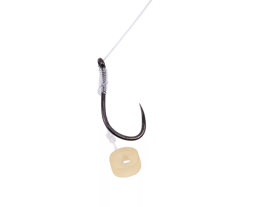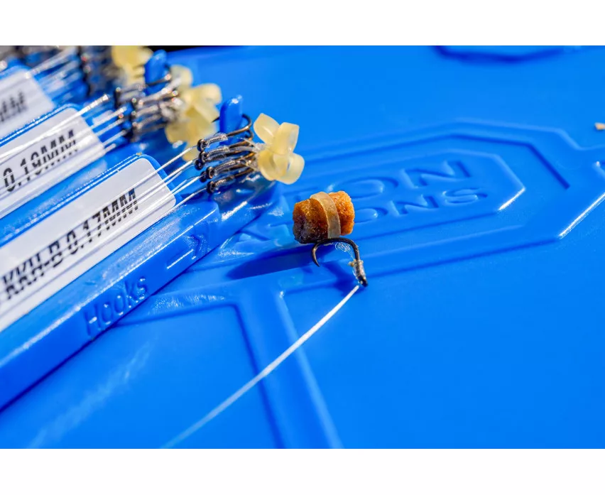 Extrem starke, zuverlässige Haken wurden am Ende unserer Reflo Power Schnur befestigt. An den KKH-B Mag vorgebundenen Vorfächern auf den Vorfachhaltern haben wir die Haken mit knotenlosen Bindungen befestigt, und zum Beködern haben wir einen strapazierfähigen Silikonring verwendet. Eine ausgezeichnete Wahl, wenn Sie mit harten Pellets unterschiedlicher Größe fischen möchten.