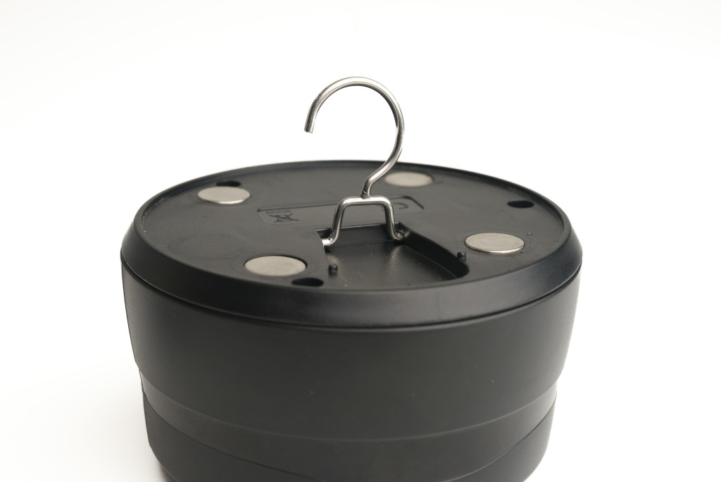 Das Gehäuse der Lampe besteht aus stoßfestem und wetterbeständigem Verbundkunststoff, der Feuchtigkeit am Wasser und versehentlichem Herunterfallen standhält. Dank ihres kompakten Designs nimmt sie nur minimalen Platz in der Ausrüstung ein, kann aber dennoch einen großen Bereich im Zelt beleuchten. Die Abmessungen des Lampenkörpers wurden so optimiert, dass er auch in eine kleinere Tasche passt, und sein Gewicht ist gering genug, um das Zeltgewebe bei magnetischer Befestigung nicht herunterzuziehen. Die interne Elektronik besteht aus hochwertigen Komponenten, die eine störungsfreie Funkverbindung mit den Anzeigern gewährleisten.