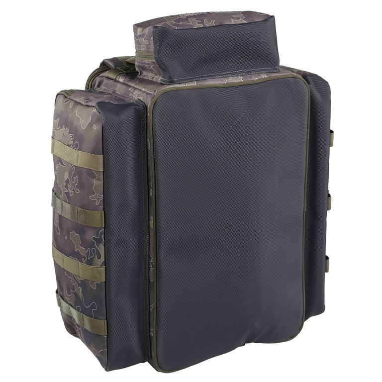 Der Rucksack vom Typ CARRYALL verfügt über ein Gesamtvolumen von 45 Litern. Er ist aus exklusivem Camo-Textil gefertigt und hat einen wasserdichten Boden. Ausgestattet ist er mit verstärkten Reißverschlüssen und einer hochdichten Polsterung. Er lässt sich weit öffnen und bietet drei Außenfächer. Das Hauptfach hat ein Volumen von 30 Litern (46x28x25 cm).