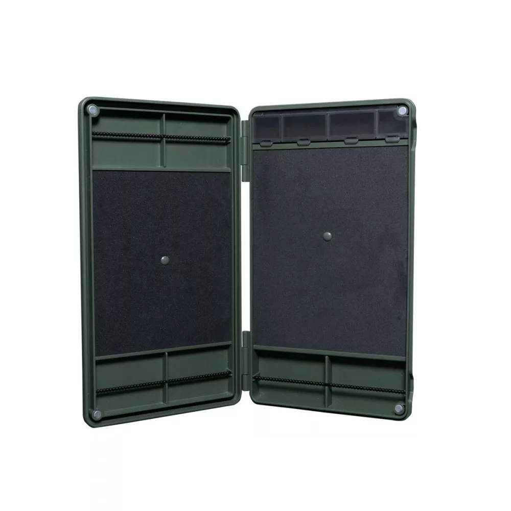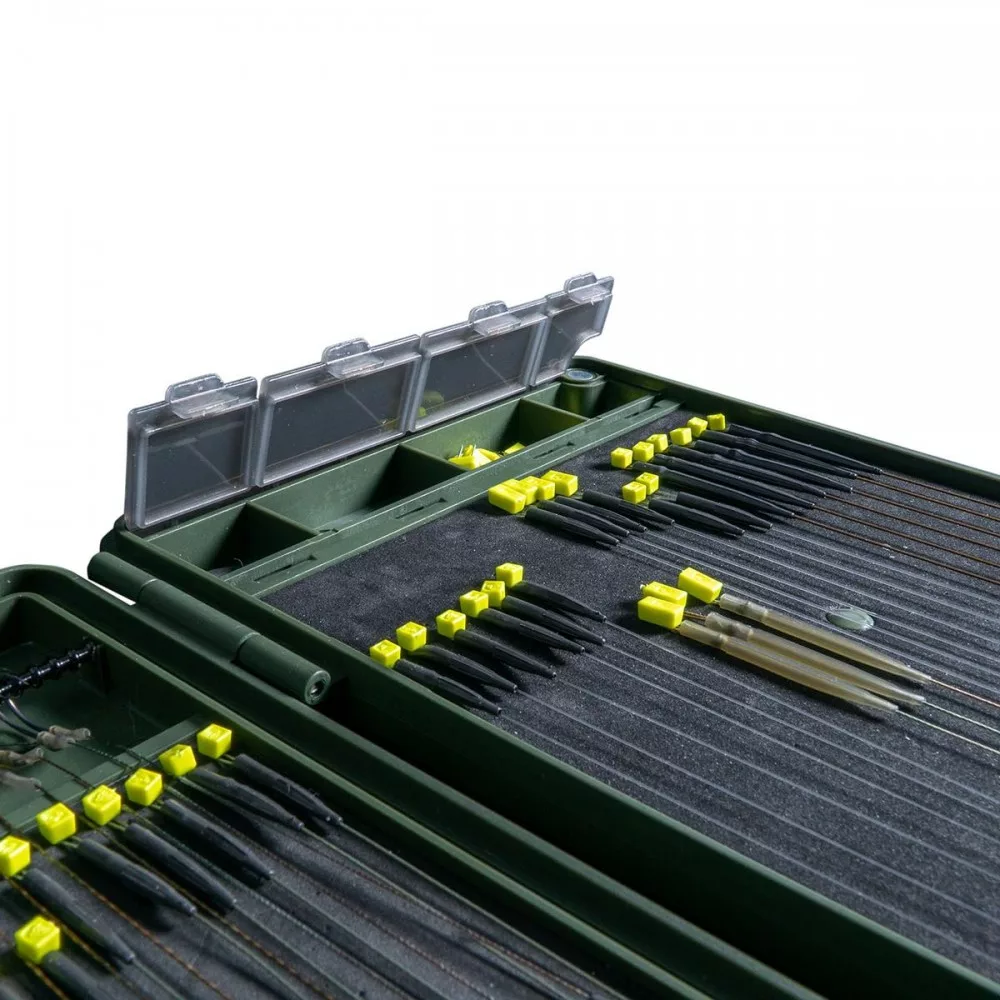 Da das Vorfach ein wichtiger Teil der Angelausrüstung ist, ist es sinnvoll, es ausreichend sicher aufzubewahren. Die Ridgemonkey Armoury Rig Box ermöglicht genau das. Obwohl leicht und kompakt, kann die Ridgemonkey Armoury Rig Box mehr als 100 Montagen gleichzeitig aufnehmen, was bedeutet, dass Sie immer für alles bereit sind.