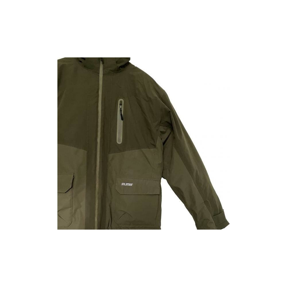 Bei Thermokleidung ist neben der Gewährleistung eines angemessenen Wärmegefühls auch die Wasserbeständigkeit wichtig. Natürlich enttäuscht das SILSTAR Thermoset auch in diesem Fall nicht! Das Basismaterial der Kleidung ist 100% hochabriebfestes TWILL PEACH Mikrofasergewebe aus Polyester, das eine besonders hohe Wasserbeständigkeit aufweist. Die Jacke und die Latzhose sind mit einer 8000/800 MVP PVC-Membranbeschichtung versehen, und jede einzelne Naht ist zusätzlich verklebt. Dank der oben genannten Parameter und Eigenschaften ist die SILSTAR EXCLUSIVE LINE Kleidung vollständig wind- und wasserdicht! Die Taschen an der Jacke, insgesamt drei Stück, haben ebenfalls den entsprechenden Schutz erhalten, so dass auch diese 100% wasserdicht sind. Natürlich sind alle Reißverschlüsse wind- und wasserdicht! Was nützt eine 100% wasserdichte Thermokleidung, wenn sie nicht bequem und praktisch ist! Hier sinc auch keinen Grund zur Sorge, denn der Kragen der Jacke ist hoch und bietet somit perfekten Schutz vor Wind. Außerdem gibt es am Kapuzenbereich ebenfalls einen Kragen, der dank der Klettverschluss-Ergänzung doppelten Schutz bietet. Um das Wärmegefühl zu erhöhen, kann die Jacke an mehreren Stellen individuell angepasst werden. Der Taillenbereich der Jacke wird durch ein elastisches Innenband am Körper gehalten. Diese Eigenschaft werden wir besonders bei häufigen Positionswechseln während des Angelns schätzen, da im Wesentlichen kein Wind und keine Kälte unter die Jacke gelangen kann.