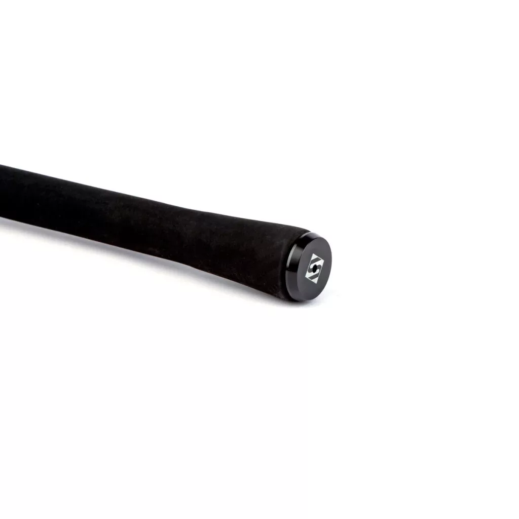 Der mattschwarze DPS Rollenhalter fixiert die Rolle stabil, während der schlanke japanische Schrumpfgummigriff einen bequemen Halt bietet, insbesondere bei längeren Drills. Die schwarze eloxierte Endkappe mit lasergeätztem 'S'-Logo am Rutenende verleiht der Ausrüstung ein elegantes Aussehen.
