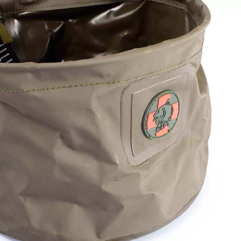 Der praktische, extra strapazierfähige, aber leichte Carp Care Faltwassereimer mit geschweißten Nähten und Gurtbandgriffen für Stärke, sowie einem starren Aluminium-Oberring, damit er beim Befüllen seine Form behält, aber für den Transport flach zusammengeklappt werden kann.
