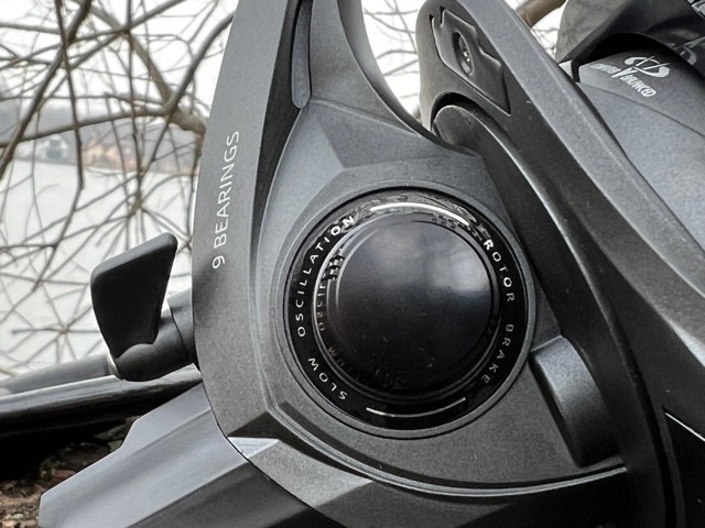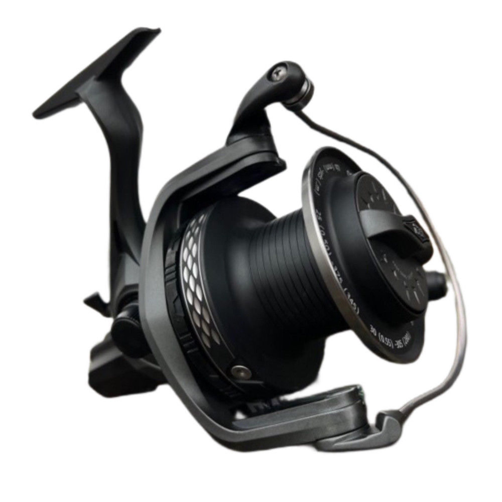 Frontbrems-Karpfenrolle mit 14000er Spulengröße und 15kg Bremskraft. Schwarzes Gehäuse, schwarze Spule, mit Silbermuster und Spulenschürze, die verhindert, dass sich die Schnur unter der Spule verfängt. 9 rostfreie Kugellager sorgen für einen perfekten Lauf.