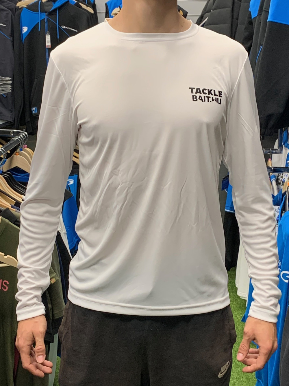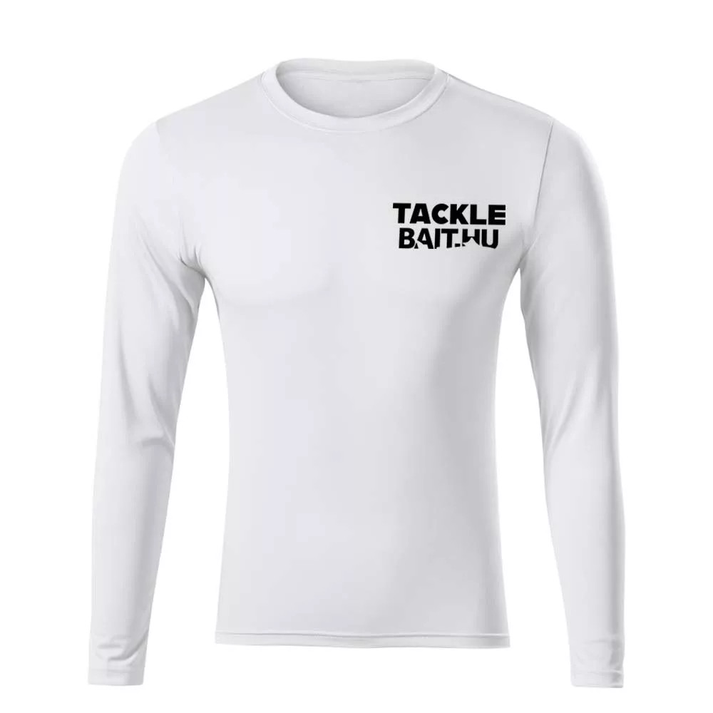 Langarm-T-Shirt aus schnell trocknendem Material. Auf der Brust ein dezenter TackleBait-Schriftzug, auf dem Rücken ein größeres gedrucktes Logo. Ideal für Sport- und Freizeitaktivitäten. In verschiedenen Größen erhältlich, unisex.