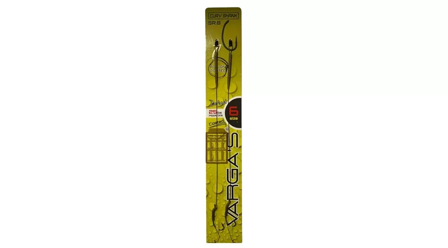 Der Vargas Curv Shank SR.8 6-Öhrige, mit Widerhaken versehene, geflochtene Vorgebundene Haken wurde für Angler entwickelt, die stabile und kontrolliert funktionierende Endmontagen für große Karpfen suchen. Das VARGA’S SR8 Curv Shank Coated Rig ist ein hochwertiges, beschichtetes Vorfach, das speziell für anspruchsvolle Drills mit großen Fischen entwickelt wurde. Die Form des Curv Shank Hakens dreht die Spitze auf natürliche Weise zur Unterlippe des Karpfens, was einen effektiven Hakenbiss gewährleistet, selbst wenn der Fisch den Köder vorsichtig untersucht oder „ausspuckt“.