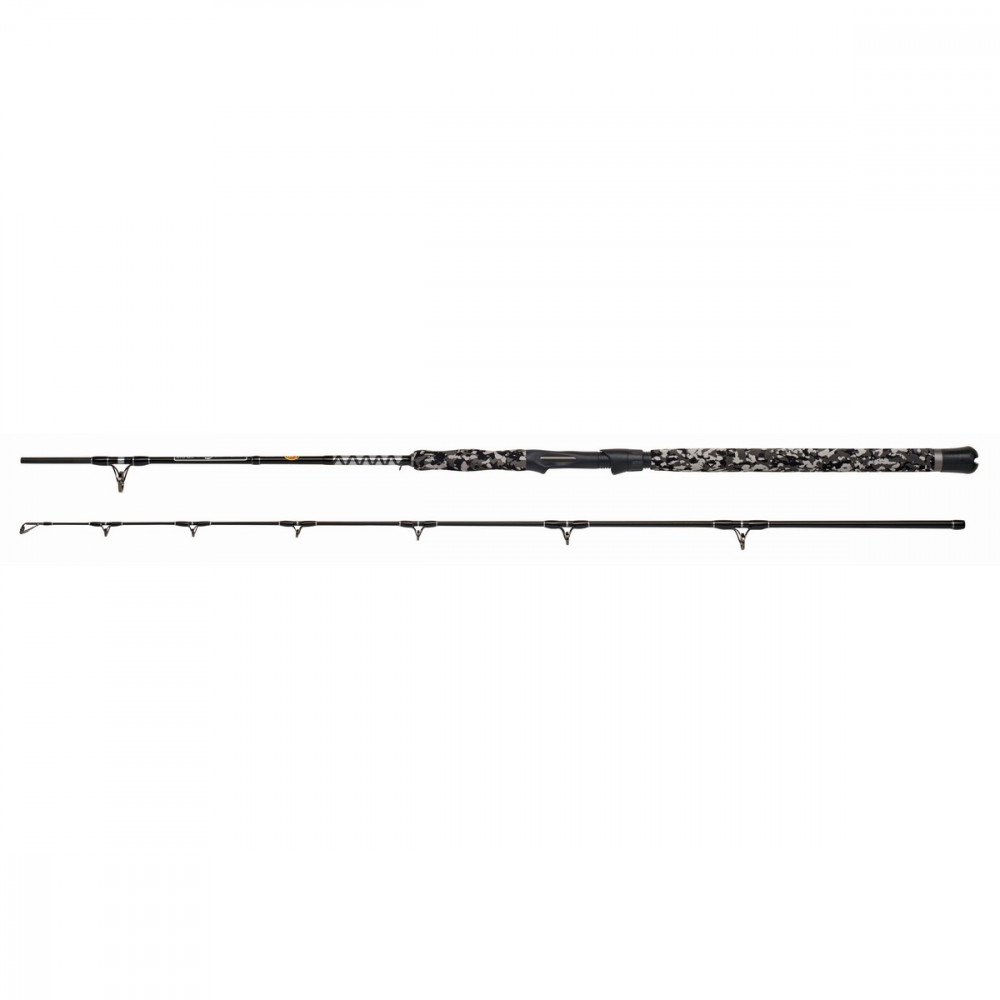 Der Griff ist komplett mit hochwertigem Duplonmaterial überzogen, ästhetisch, geschwungen und modern gestaltet. Dank der harten, schwammartigen Oberfläche bietet er auch mit nassen Händen einen stabilen Halt während des gesamten Angelns.An der Rute wurde der am häufigsten verwendete Schraubrollenhalter angebracht. Die Beliebtheit dieses seit Jahrzehnten verwendeten Typs liegt in seiner Einfachheit und zuverlässigen Konstruktion. Zur Befestigung der Rolle dienen zwei kunststoffbeschichtete Backen, die den Rollenfuß aufnehmen können, wovon eine mit einer großen Mutter festgezogen wird.Beim Drill großer, aggressiv verteidigender Fische ist es wichtig, dass jedes Element der Angelausrüstung von zuverlässiger Qualität ist. Die verstärkte Beringung mit abriebfester Oberfläche hält auch der Belastung durch harte, langwierige Drills stand.