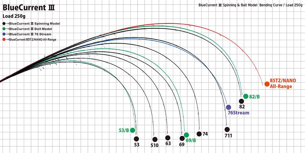Diese Serie repräsentiert die Hauptrichtung der Light Game Linie von Yamaga Blanks. Zu den Zielen der BlueCurrent III gehören ein breiterer Wurfpunkt, der das Werfen erleichtert, eine nahtlose Biegung, die den Spannungsverlust verhindert, und eine Verlängerung der Anglerhand für schnellere Reaktionen.